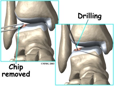Surgery for osteochondritis usually involves removing the loose fragment of cartilage and bone from the ankle joint and drilling small holes in the injured bone. When the fragment is removed, a defect shaped like a small crater is left in the talus bone. It is this area where the drill holes are made. The drill holes allow new blood vessels to grow into the defect and help to form scar tissue to fill the area. Eventually this new scar tissue smoothes out the defect and allows the ankle to move more easily. We routinely perform this surgery with arthroscopic techniques